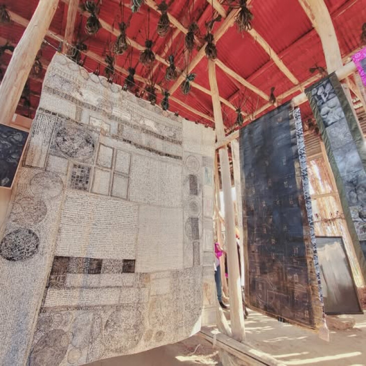Durante más de dos años Teresa Salcedo caligrafió minuciosamente textos del poeta japonés Kamo No Chomei, del místico sufí Ibn al Arabi y versos de mujeres poetas de al-Andalus en dos telares de lino que instaló en el secadero de tabaco de Cúllar Vega el lugar más adecuado para presentarlos. En el análisis de estas construcciones que sembraron la vega granadina desde fines del siglo XIX, Juan Francisco García Nofuentes encuentra una correspondencia evidente con la teoría de “El principio de la vestimenta en el arte de la construcción” del arquitecto alemán Gottfried Semper, para quien el origen de la construcción residía en las técnicas textiles. La sinceridad constructiva defendida por Semper está presente en los secaderos, no sólo en el uso de los materiales locales sino también en el proceso de ensamblaje, en la presencia de nudos y costuras, y en los revestimientos ligeros a modo de vestidos intercambiables. Semper utilizó el término wand (pared) cuya raíz: gewand significa vestido, en lugar de la palabra mauer (muro). Teresa Salcedo colocó suspendidas los dos estelas, y algunos vestidos grafiados con poemas, en las estructuras de las que en su día colgaron las hojas de tabaco. El sol iluminó los tejidos suavemente mecidos por el viento que se colaba por la piel abierta del secadero, semejante en su precariedad esencial a una cabaña, como la última que Chomei describió en su libro y que Salcedo evoca adaptando sus medidas a las de la superficie del lino, “apenas tres metros de largo y no llegaba a dos de alto”. En la de Chomei, también están las cabañas de quienes decidieron apartarse en la seguridad de que la soledad procura el conocimiento del mundo, al decir de Ibn al Arabi: Matsuo Basho, Fátima de Córdoba y Shams de Marchena, maestras místicas sufíes de Ibn al Arabi, o Agnes Martín… Cada uno de los talleres de Teresa Salcedo son cabañas, etapas del tránsito de su viaje nómada.